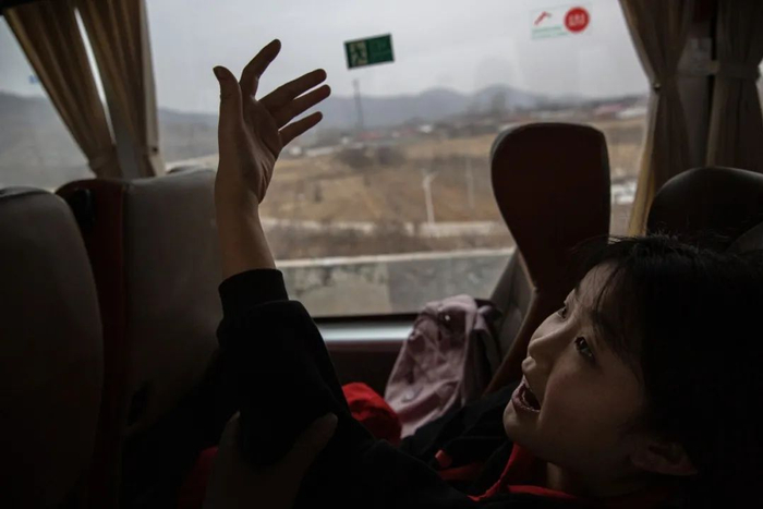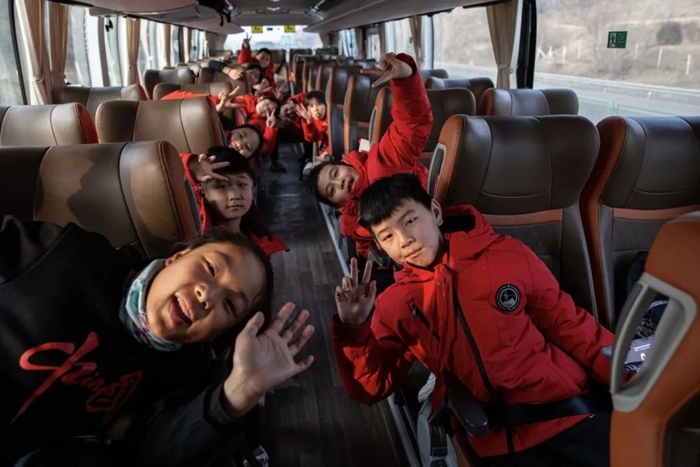2月12日,河北省保定市阜平县前往北京的车上,合唱团的孩子们。新京报记者郑新洽 摄