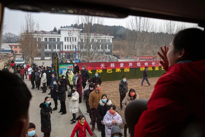 2月12日,河北省保定市阜平县城南庄镇八一学校,合唱团在家属和乡亲们的欢送下出发到北京参加冬奥会闭幕式。新京报记者郑新洽 摄