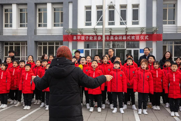 2月12日,河北省保定市阜平县城南庄镇八一学校,乡亲们为马兰花合唱团的孩子们赴京参加冬奥会闭幕式举行欢送仪式。图为出发前,邓小岚老师带孩子们唱歌。新京报记者郑新洽 摄