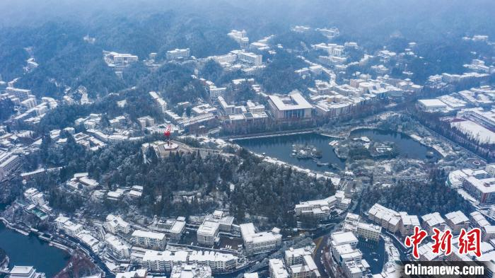 航拍井冈山挹翠湖公园雪中美景。 李小明 摄