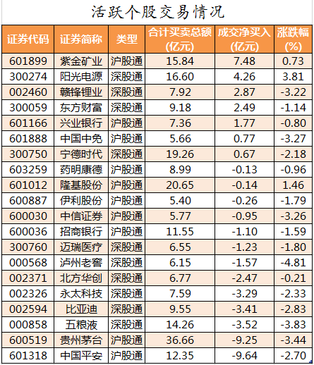 北向资金今日净卖出33.58亿元。其中,沪股通净卖出23.56亿元,深股通净卖出10.02亿元。净买入较多的有紫金矿业、阳光电源和赣锋锂业,净买入金额分别为7.48亿元、4.26亿元、2.87亿元。北向资金净卖出较多的有中国平安、贵州茅台、五粮液、比亚迪、永太科技,净卖出金额分别为9.64亿元、9.25亿元、3.52亿元、3.41亿元、3.29亿元。