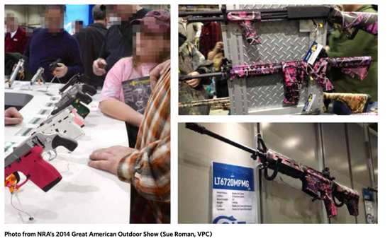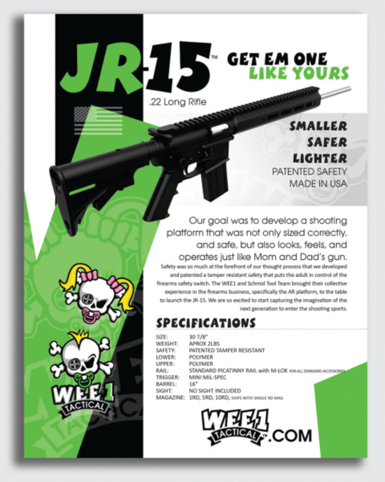一些枪支制造商还针对儿童设计了体积轻巧、样式活泼的彩色外壳步枪和手枪,并有针对女孩的粉色版。武器制造商WEE1甚至推出青少年版本的AR-15步枪——JR-15。AR-15曾被1994年的《联邦突击武器禁令》禁止销售。但该法案于2005年过期后,销售额呈爆炸式增长。