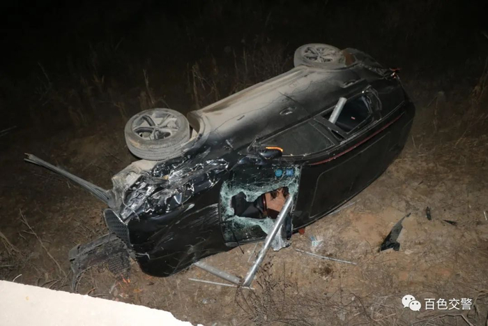 2021年12月19日00时40分,百色市那坡县进城大道百大路段,驾驶人杨某搭着老乡回县城时因没有休息好,开车时犯起了迷糊,导致车子直接撞上了路边的指示标牌和护栏,翻倒在路边。