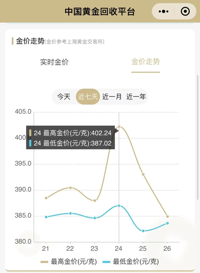 中国黄金回收平台显示,2月以来,回收金价呈上涨趋势。到了2月24日这一天,回收金价达到高峰,最高至402.24元/克,最低为387.02元/克,25-26日回收金价呈现回落趋势。
