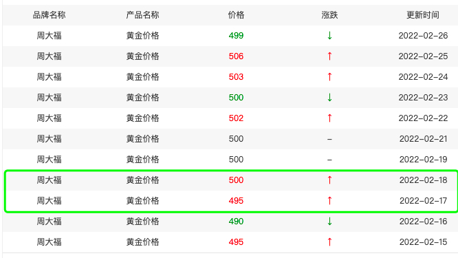 上述店员均表示:“店内金价每天都在变化,上一周上涨明显,但近两日又下跌了一些。”以周大福为例,根据行业网站金投网的数据,周大福的实物黄金价格在2月18日突破500元/克大关,到2月25日上涨至506元/克,2月26日跌破500元/克。