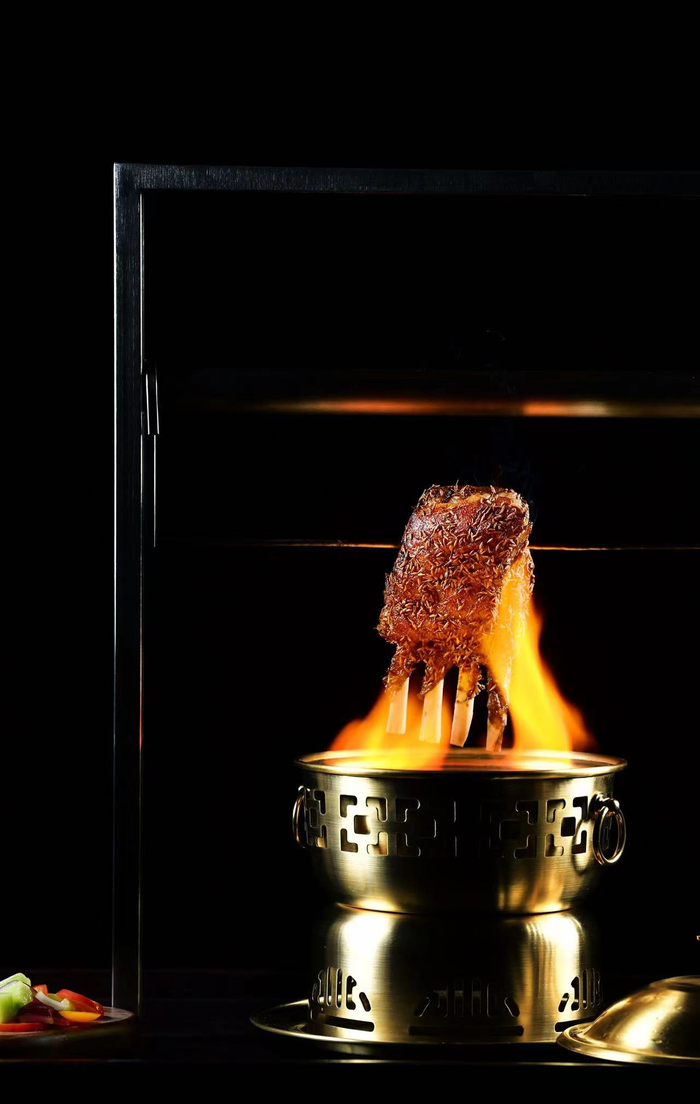 除了烤鸭,这里的新菜也值得一试,比如孜然蜂蜜烤羊排、烧椒花枝卷、话梅蒜子焗白鳝、剁椒鲜虾白菜卷等。其中,孜然蜂蜜烤羊排借鉴西式羊排烘烤方式,刷上秘制蜂蜜酱,让羊排表皮酥脆,肉质鲜嫩,桌边服务更是充满仪式感——点燃火焰,羊肉香气完全被激发出来。剁椒鲜虾白菜卷的创意来自老北京传统菜式“芥末墩”,只是将酱汁改为新鲜虾泥和自制泡椒,经过蒸制,口感丰富。