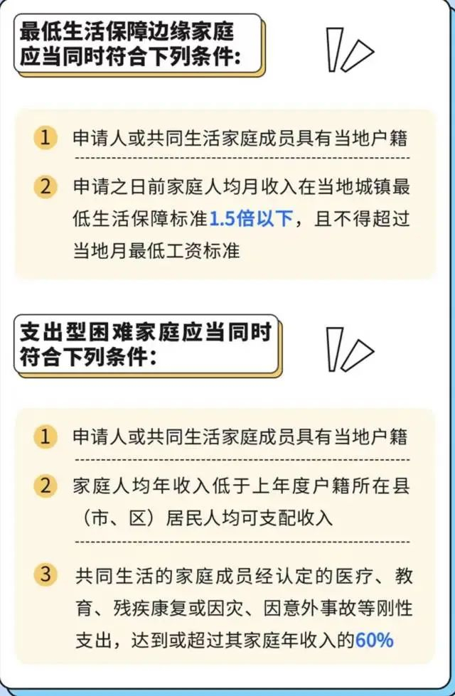 今日起,《广东省最低生活保障边缘家庭和支出型困难家庭救助办法》正式施行。明确规定,共同生活的家庭成员人均收入、财产和生活状况符合当地相关标准的家庭,经申请审核确认即可进行分别认定。认定后,由民政部门为其提供基本生活救助,相关职能部门在医疗、教育、住房以及就业等方面提供专项救助。