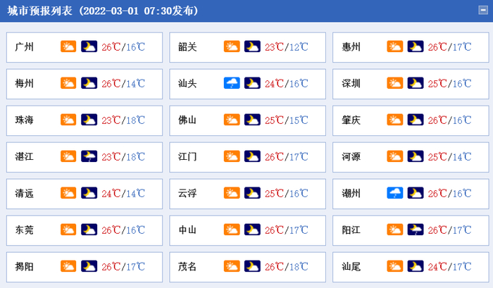 3月1日,韶关、清远和粤东阴天间多云有分散(零星)小雨,其余市县多云到阴天,局部小雨;大部分市县早晚有轻雾或雾。早晨最低气温:粤北市县10~12℃,粤西沿海市县15~17℃,其余市县12~14℃。