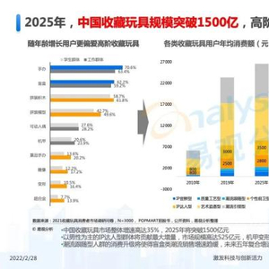 据易观分析,2020年,中国收藏玩具消费进入爆发期。到2025年,中国收藏玩具规模突破1500亿元,高阶收藏玩具将接棒盲盒爆发。同时,到2025年,中国收藏玩具核心消费群体将突破1亿人。