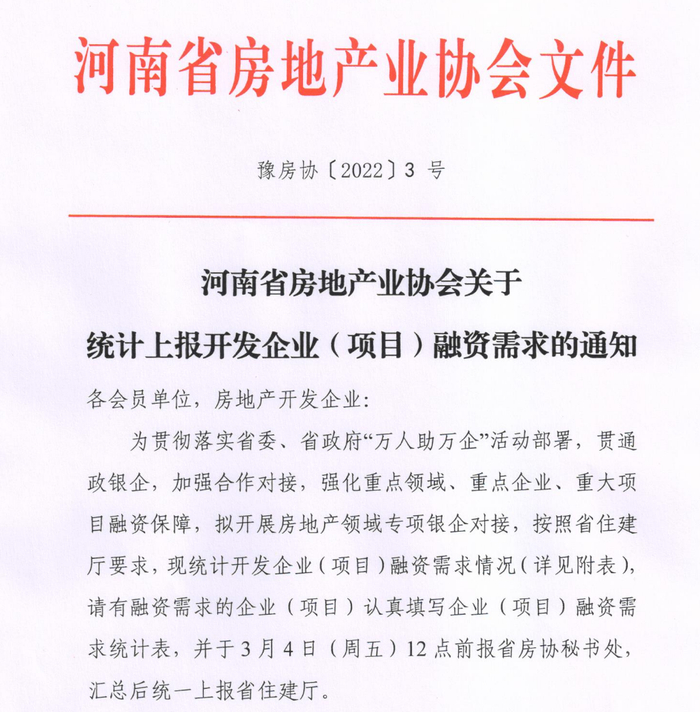3月1日,河南省房地产业协会发布关于统计上报开发企业(项目)融资需求的通知。