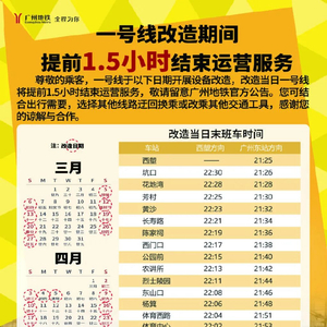 广州地铁相关负责人提醒道:“一号线提前收车还会影响到临线的末班车换乘时间,市民届时可留意车站的末班车公告信息,如与一号线有换乘,需按提前一个半小时倒推做好准备,或选择其他线路出行。”