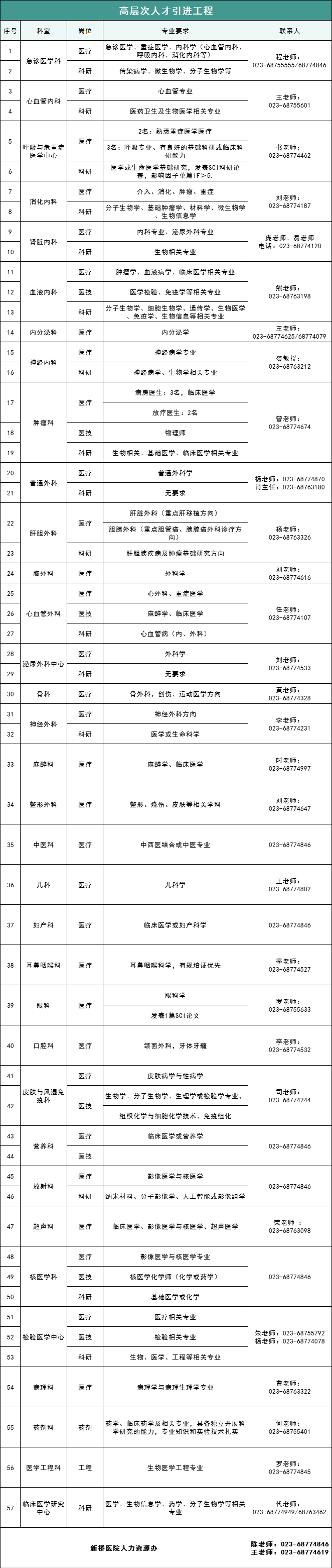 医院历届党委十分重视学科人才队伍建设,建立了完整的人才培养、引进、选聘、晋升等机制。今年,为进一步吸引高层次人才来到重庆,落户新桥,医院开辟了博士“绿色通道”,专门制定了“暖心福利”。