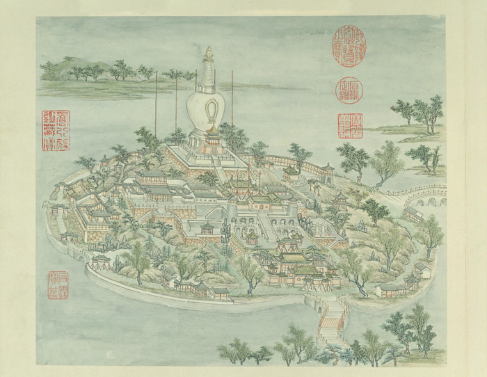 据《金史》相关记载,大定六年(1166),金人在中都城北修建“离宫”,名为“太宁宫”,于大定十九年(1179)年建成。太宁宫选址在高梁河畔,紧邻什刹海、北海、中海的位置。这里原本就有一大片湖泊,称为白莲潭,周围是一片水草丰美的景象。琼华岛就在太宁宫苑之中。