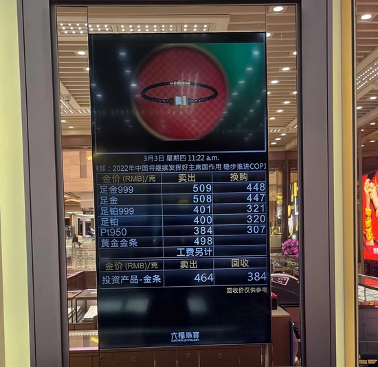 记者走访了深圳福田中心的皇庭广场几家品牌珠宝了解到,截至3月3日,周大福、周生生、六福珠宝、老凤祥的足金价格为508元或509元每克,铂金单价为384每克。不过,据多家饰品店店员介绍,随着三八妇女节临近,品牌均有不同程度的优惠活动,以足金为例,不同品牌均推出了15元至30元不等的减价促销活动,折算下来实际价格大部分在480元附近。