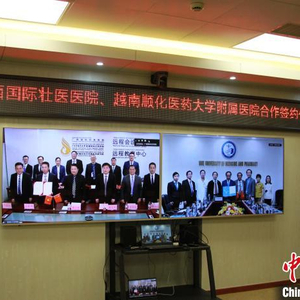 中新网南宁3月3日电(杨陈 王煜霞 何睿)广西国际壮医医院3日与越南顺化医药大学附属医院通过远程视频会议的方式签署协议书,加强传统民族医药领域合作。