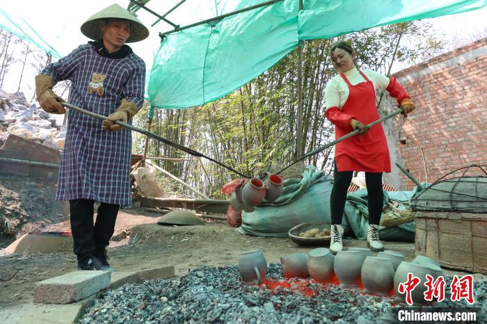 3月4日,廖亮清在进行“威宁砂陶”器具制作的最后一道工序。 瞿宏伦 摄