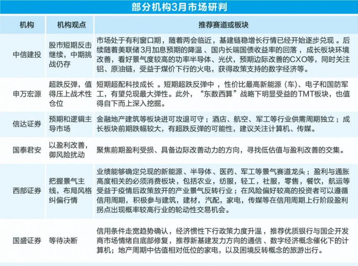 全国两会将指明政策着力点和经济增长目标,政策定调将为全年结构性机会提供重要参考。机构对3月行情普遍保持乐观。多数机构认为,外部扰动影响有限,A股底部逐步确认,3月市场将迎来阶段性修复。