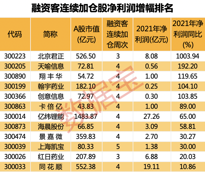 按照最新公布的年报、快报、预告净利润下限数据计算,上述融资客连续加仓的34只创业板股中,有11股2021年净利润同比增长20%以上。北京君正、天喻信息、翔丰华、翰宇药业、创意信息等5股净利润翻倍增长。