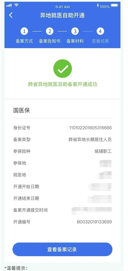 ■ 备案信息提交后,可以看到备案人的基本信息,点击【查看备案记录】按钮,可以查询异地就医备案状态