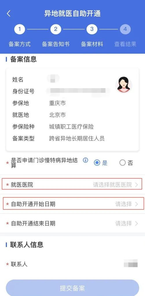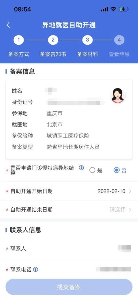 ■ 填写备案信息,联系人信息,勾选【是否申请慢特病异地结算】为否,选择【自助开通日期】(需要注意开通日期需要选择在就诊入院之前)、【自助开通结束日期】,上传相关材料,确认无误后,点击【提交备案】。