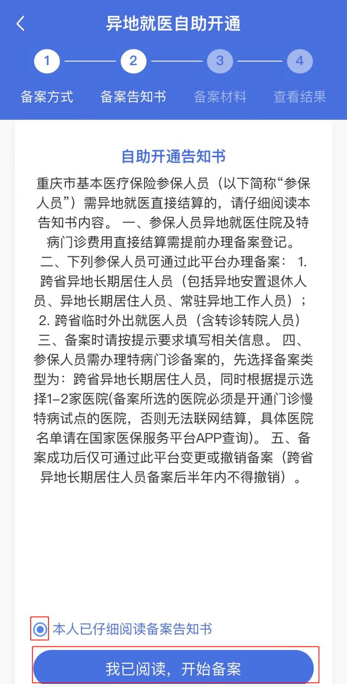 ■ 仔细阅读自助开通告知书后,勾选【本人已仔细阅读备案告知书】—点击【我已阅读,开始备案】,进入备案申请。