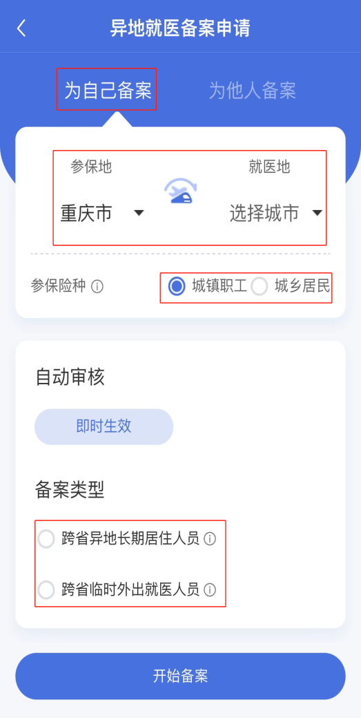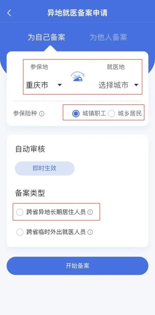 ■ 依次点击【为自己备案】—筛选【参保地】和【就医地】—筛选【参保险种】,筛选【备案类型】时要选择【跨省异地长期居住人员】,最后点击【开始备案】