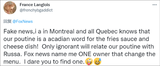 还有人表示,加拿大魁北克的每一个人都知道“普丁”是一道菜,“只有无知的人才会把它和俄罗斯扯上联系”。