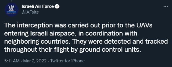 以色列空军称,这次拦截行动是在无人机进入以色列领空前实施的,并且得到了周边国家的配合。这两架无人机在整个飞行过程中,都被以色列的地面控制单元监测并且跟踪着。