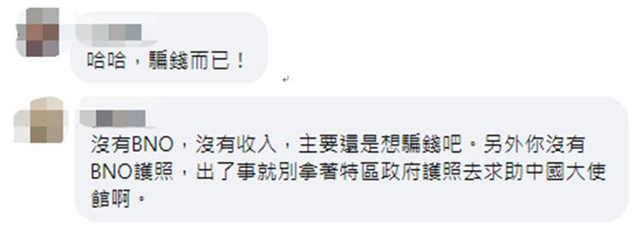 “骗钱而已!”有网友看到林宇轩这一举动,在其脸书评论区留言嘲讽。还有网友说,出了事不要拿着香港特别行政区护照去求助中国大使馆。