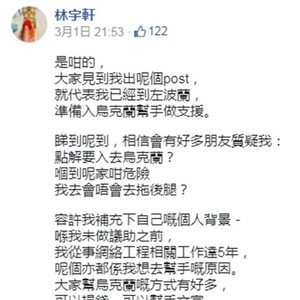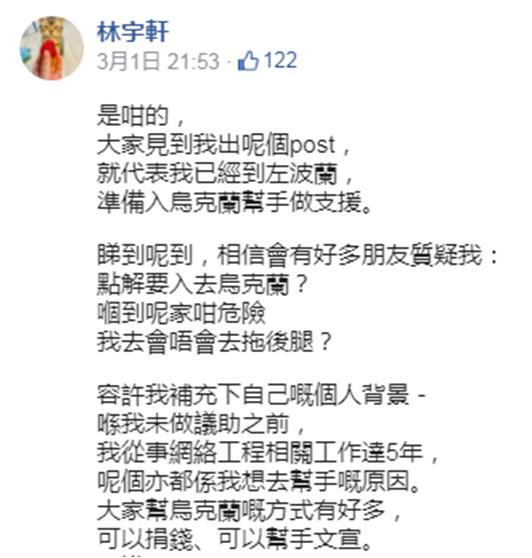 俄乌冲突爆发后,林宇轩3月1日在脸书发文,声称自己要去乌克兰,并介绍自己有网络工程方面的工作经验。接着他开始呼吁网友打钱,称“大家帮乌克兰的方式有很多,可以捐钱……”