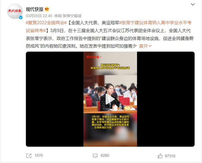 这个建议经媒体报道之后,成为了当天网上的热点,《现代快报》对张常宁建议的报道,引发了网友6280次评论、97316次点赞。