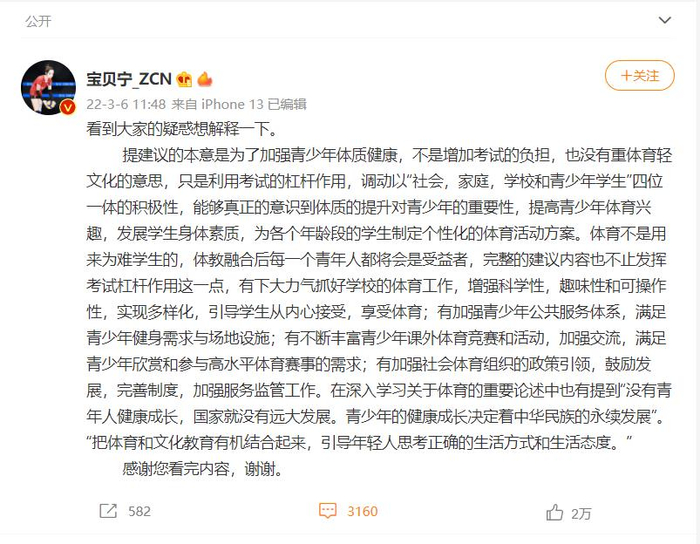 很快,#张常宁建议体育纳入高中学业水平考试省统考#就上了热搜,她本人不得不在个人微博进行了二次回应。