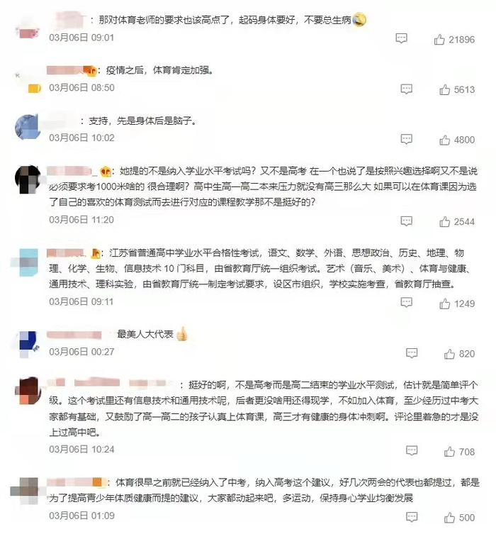部分网友认为这个建议不错:“疫情之后,体育肯定加强。”“高中会考加入体育测试没毛病啊!德智体美劳全面发展,就得从小抓起,小学中学大学一以贯之,大学一直都有体育必修和体测的。”