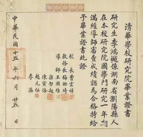 清华国学研究院毕业生李鸿樾的毕业证书上有清华四大导师的名字和签章,曾被誉为“史上最牛毕业证”。