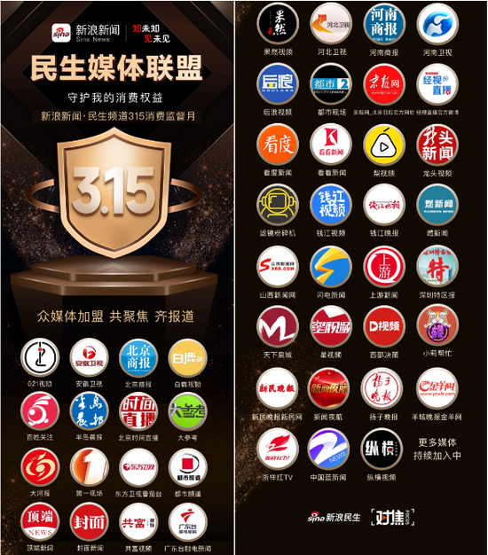 随着新浪新闻民生频道“315消费监督月”进入报道阶段,3月7日,新浪新闻宣布携手47家来自全国各地的民生媒体成立“民生媒体联盟”,共同聚焦消费维权、产品质量问题等内容,力行监督报道之责,共同守护消费者权益。