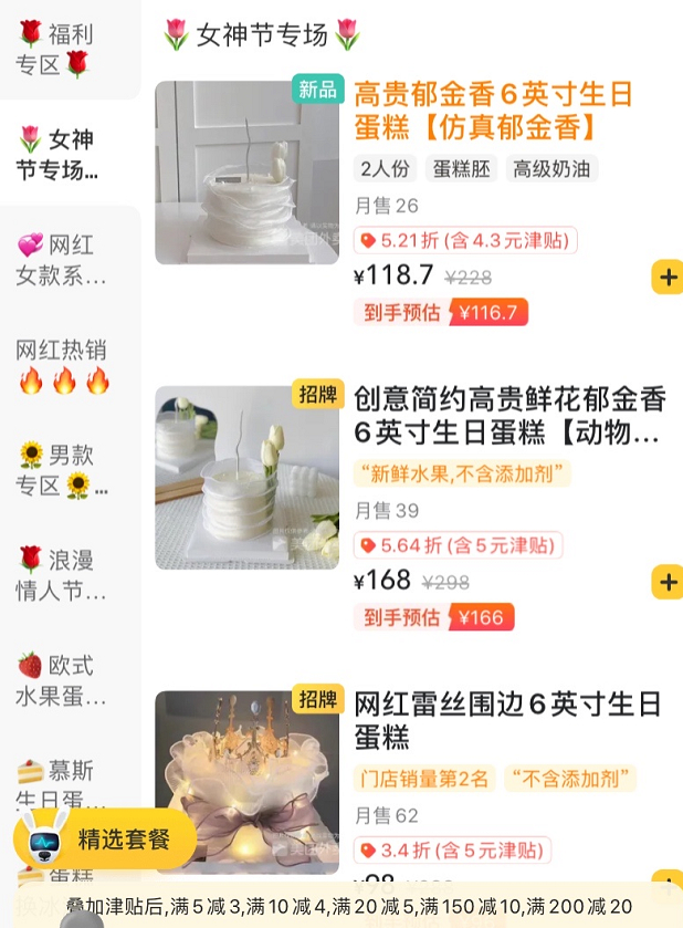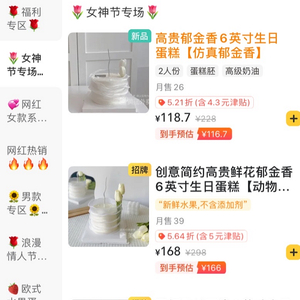 最近一款郁金香蛋糕也深受年轻女性喜爱,纯白的奶油装饰着两束简洁淡雅的粉色郁金香,打开美团上一搜索“郁金香蛋糕”,就会立刻跳出多家店铺,并且还标注“38女神节特惠”等促销字样。