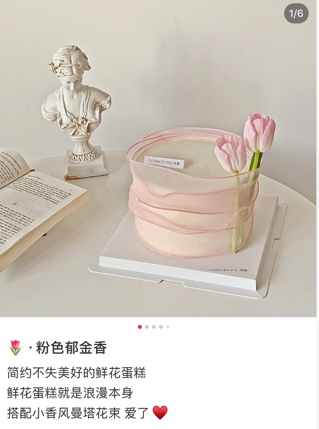 一圈圈粉色蕾丝包裹着蛋糕,旁边还插着两束淡粉色的郁金香用来装饰,这款鲜花蛋糕受到不少女生的青睐,也成了“38女神节”的爆款蛋糕。在小红书上一搜寻,不少“超仙丝带蕾丝蝴蝶结鲜花蛋糕”就会映入眼帘,配上灯光和背景,蛋糕成为“高级”“氛围感”的代名词。