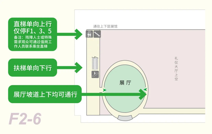 (5)进入馆内圆厅区域参观,各展厅采取单向、限流参观,同一展厅同一时间人数不超过70人。参观路线:展厅坡道上下均可通行,直梯单向上行且仅停一层、三层、五层,扶梯为单向下行,残障人士或特殊需求观众可通过值岗工作人员联系乘坐直梯。