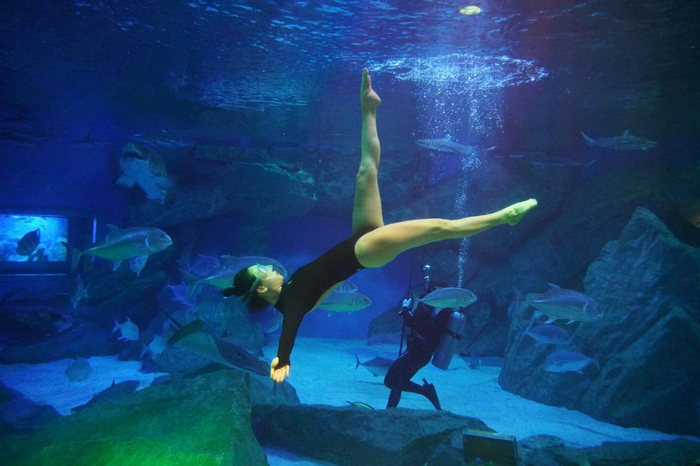 在成都海昌极地海洋公园鲨鱼馆现场,“水下瑜伽”这项运动引来众多游客们的围观,让游客们感受到“她力量”的同时,也能看到一场不一样的视觉盛宴。