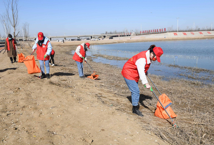 2022年3月5日,河北石家庄新乐市磁河木刀沟生态湿地公园,志愿者在捡垃圾。图/IC photo