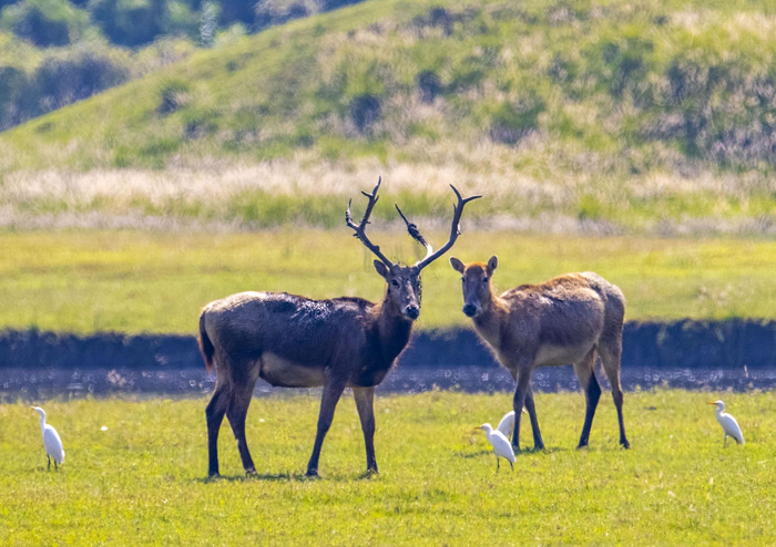 2021年10月10日,麋鹿群在江苏省泰州市姜堰区溱湖国家湿地公园保护区休憩。图/IC photo