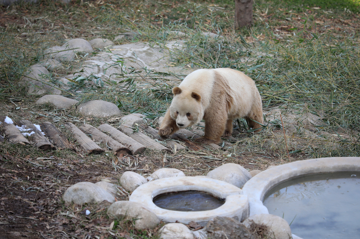 2022年2月2日,西安秦岭四宝科学公园,全球唯一圈养棕色大熊猫“七仔”在雪地上撒欢。图/IC photo
