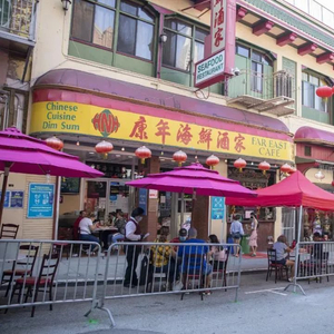 当地时间2021年2月3日,美国旧金山唐人街一家中餐厅门口,被隔离装置围起来的户外就餐区已迎来几桌食客。中新社记者 刘关关 摄
