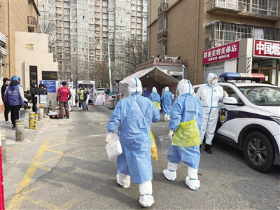 3月9日,朝阳区小红门乡鸿博家园一区,医护人员进入社区,准备为居民做核酸检测。新京报记者 王飞 摄