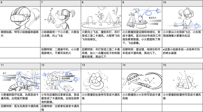 此外,VR绘画作为横跨虚实场景又极富互动感的可视化展现形式,在短片中也大展身手。在开头,团队设计了一个情节:让5岁小姑娘戴着VR眼镜绘制小火箭。经过几日的练习,小演员的心情从恐惧不安到心生向往,熟练掌握了在VR虚拟环境中绘画的技能,使得绘画镜头展现出的情绪更真实,也让“绘景未来”这一主题得到更充分的体现。