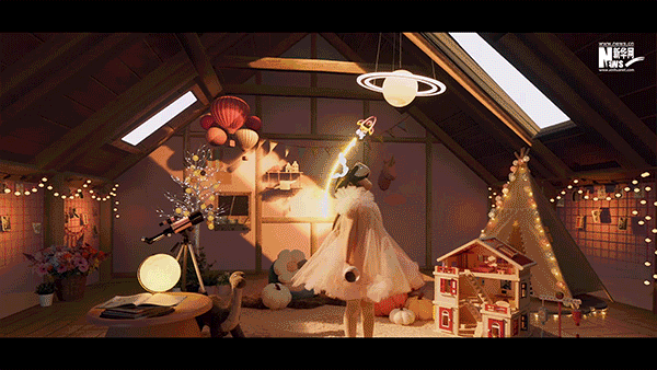 “三渲二”是业内专用术语,即三维渲染二维,是一种将三维场景或角色渲染成二维卡通美术风格的技术,让场景既有三维空间的透视感,又有卡通漫画的质感,这种空间维度的矛盾能给人神奇的视觉感受,也与短片的风格高度吻合。