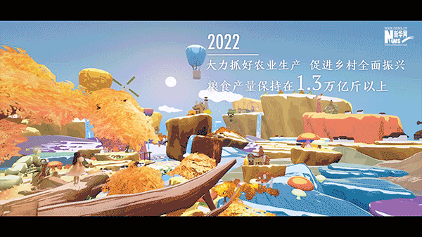 产品从儿童视角出发,运用XR(扩展现实)拍摄、VR(虚拟现实)绘画和虚幻引擎三维渲染二维等技术,构建了童话般的虚拟场景,第一次实现实景布景与虚拟场景融合,用“绘景”展现“愿景”,呈现出2022年政府工作报告的重点目标和任务。