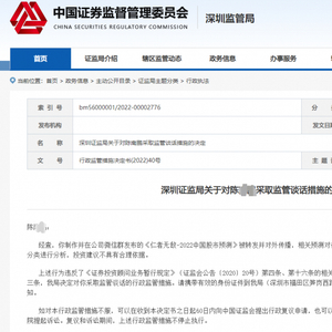 与此同时,上游新闻记者也看到,深圳证监局也对陈某所在的某证券分公司采取出具警示函措施的决定。深圳证监局称,在该公司投资顾问陈某通过公司微信群中发布《仁者无敌-2022中国股市预测》并被转发的事件中,该公司未严格根据内部制度要求对微信群消息进行监控管理,未对投资顾问相关执业行为进行有效管控。