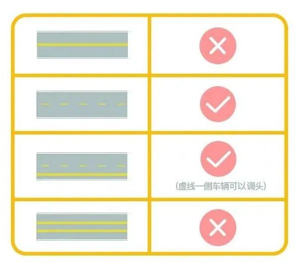 道路实线处禁止掉头。如是“黄色虚实线”,即双黄线一根是实线,一根是虚线,靠近虚线的一侧允许掉头。