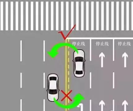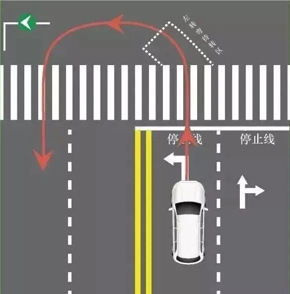 路口如有左转导向车道,左转箭头灯亮起后,车辆需要沿着导向车道掉头,禁止穿行斑马线掉头。